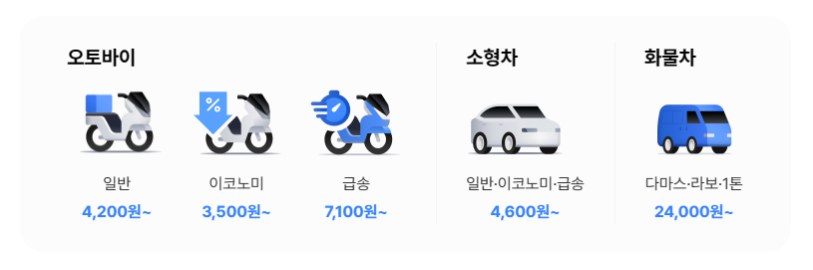 자주 이용하는 구간의 예상 요금을 확인하고, 최소 요금을 기준으로 계산하며, 실제 요금은 상황에 따라 다를 수 있으니 이용요금을 아래페이지에서 확인하시길 바라며 카카오 퀵 서비스는 합리적으로 3,500원부터 시작합니다.