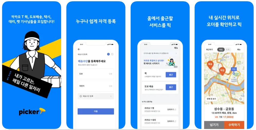 카카오 T 픽커는 퀵, 도보배송, 당일배송, 택시, 대리 등 다양한 서비스를 수행하는 기사님들을 위한 통합 앱입니다. 간단한 정보 입력으로 자격 등록을 완료한 후, 원하는 서비스를 선택하여 출근할 수 있습니다. 이 앱을 통해 여러 서비스를 편리하게 이용할 수 있어 기사님들에게 큰 편의를 제공합니다.